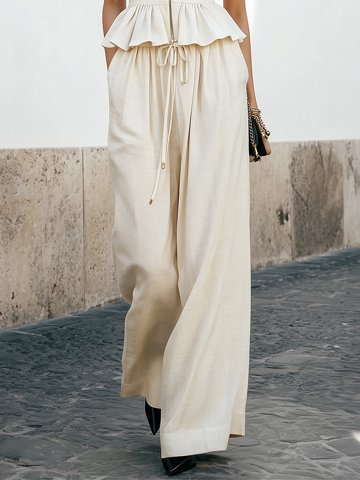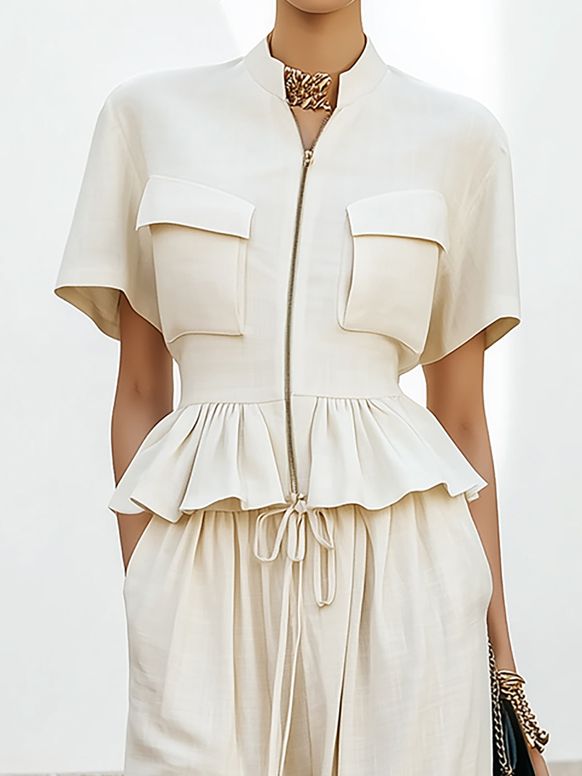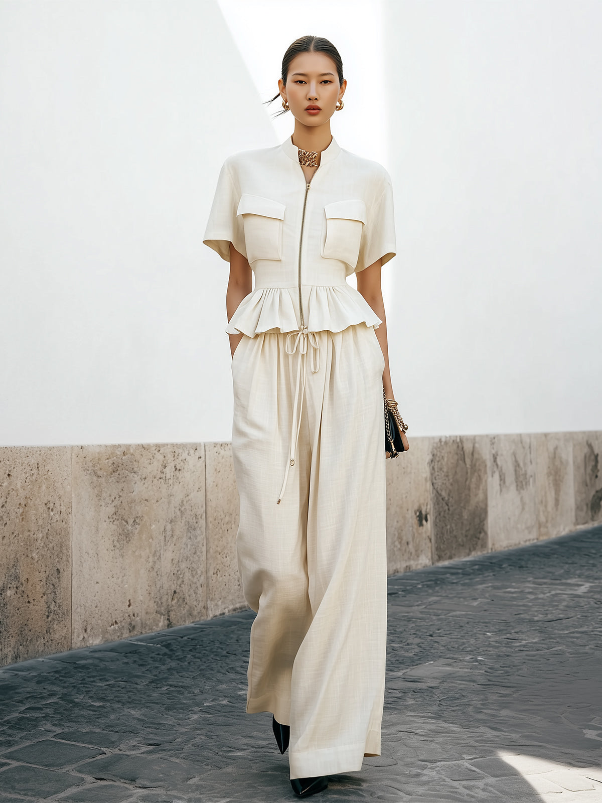 • Design: Features a short-sleeve top with a semi-high neckline, functional zip closure, subtle ruffle hem, and adjustable waist detail paired with wide-leg pants that offer a relaxed yet polished silhouette