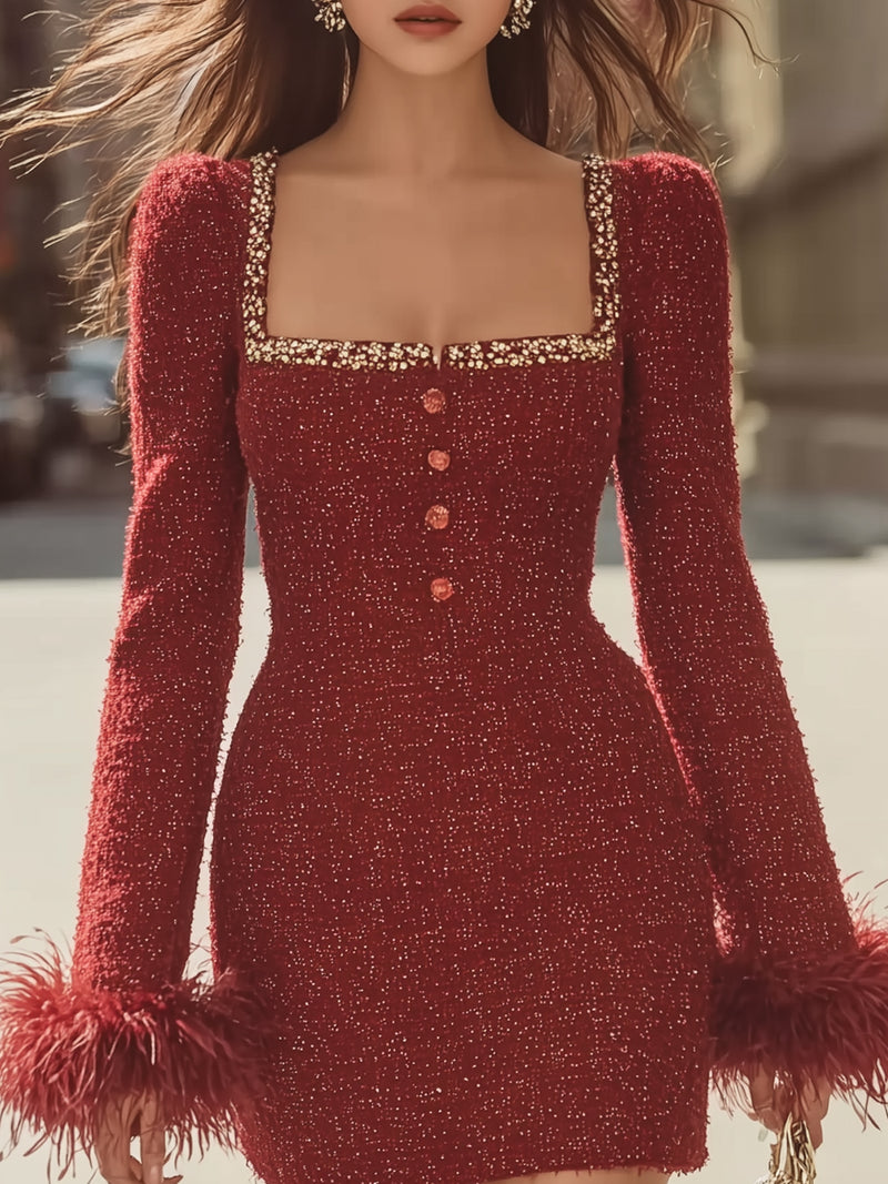 Burgundy Tweed Dress With Feather Sleeves
