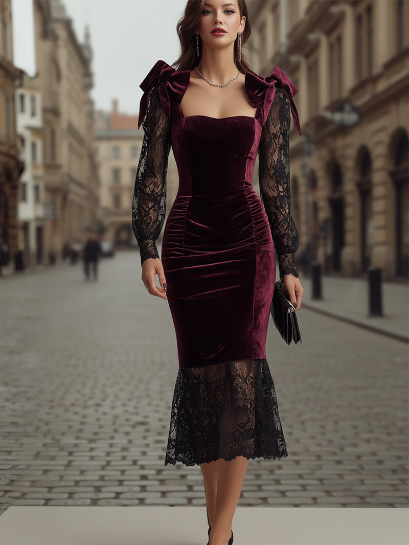 Elegant Wine Red Velvet Mermaid Dress Bow & Lace