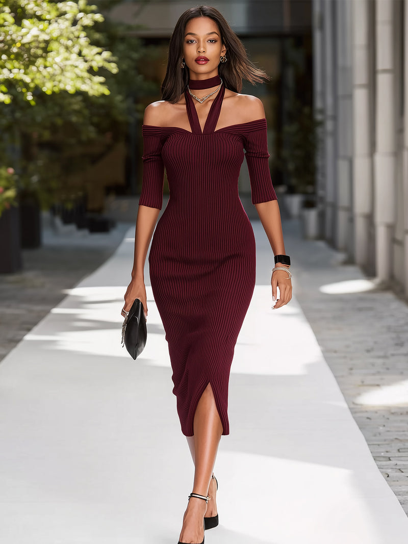 Burgundy Off-shoulder Knit Dress With Gold Buttons