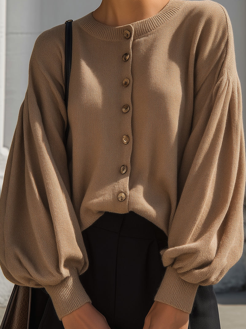 Camel-colored Knitted Cardigan With Puff Sleeves