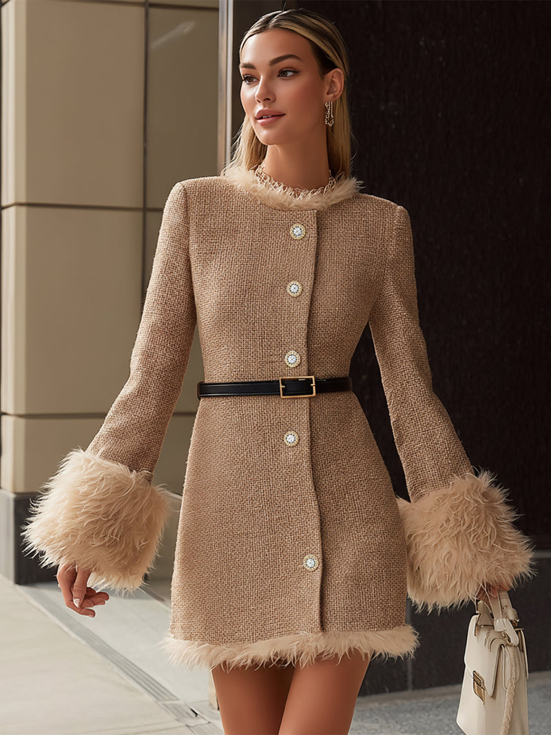Khaki Tweed Dress With Fur Detailing (Without Belt)