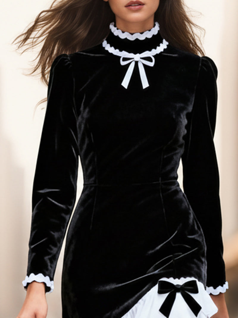 Black Tweed And Satin Paneled Dress With Sequined Detail