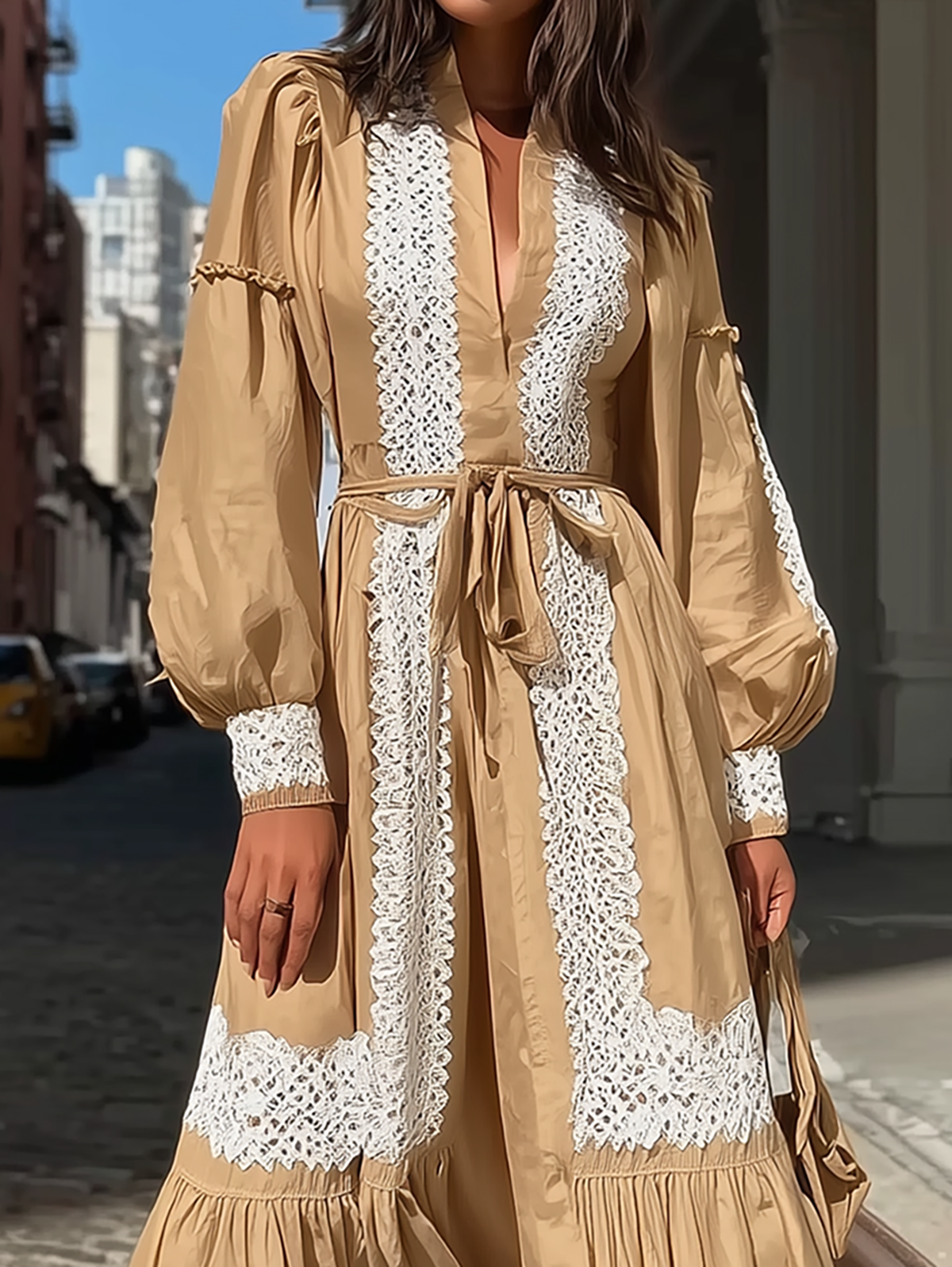 This tan maxi dress features a split V-neckline, billowy long sleeves, and a self-tie belt that cinches the waist for a flattering silhouette. Intricate white lace trim runs vertically down the bodice and decorates the tiered skirt, creating a bohemian-inspired look. The flowy, tiered design adds movement, making it ideal for beach getaways, brunch, or special daytime events. Pair it with strappy sandals and a woven tote for a relaxed, chic aesthetic.