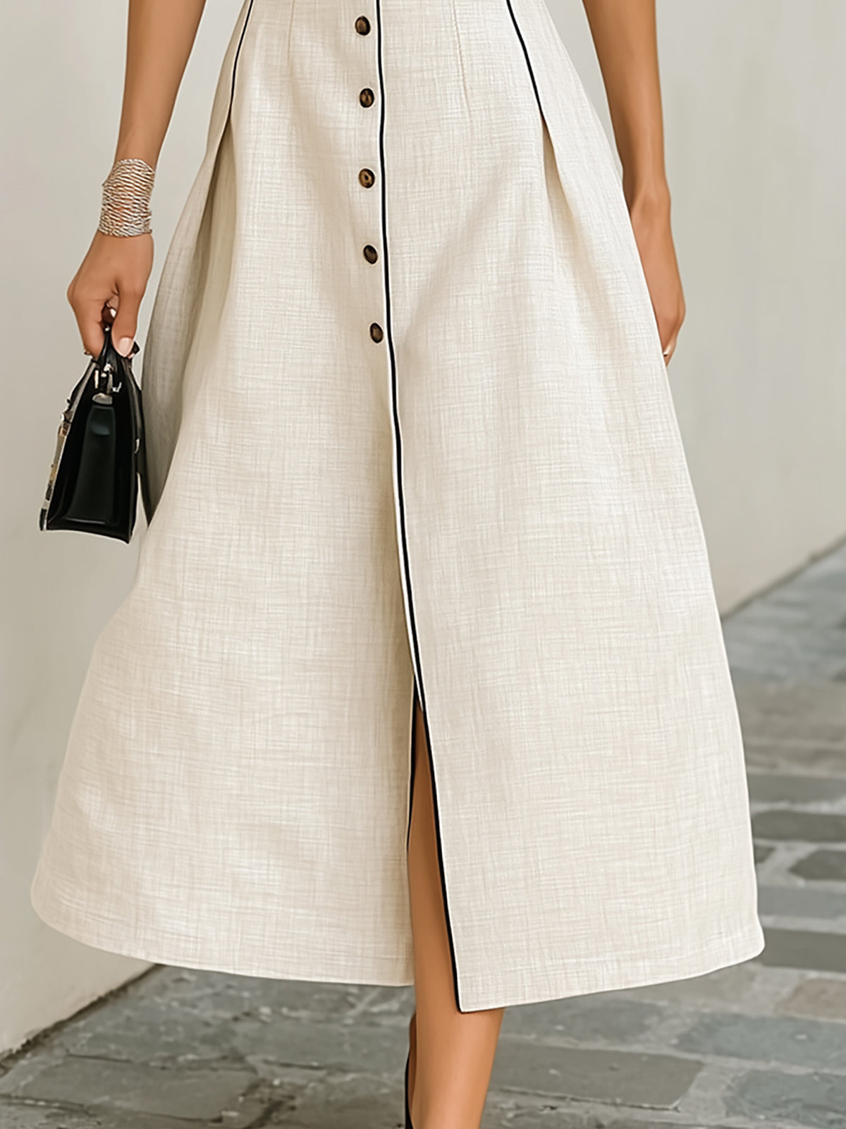 Cream Linen Blend Halter Dress With Black Trim