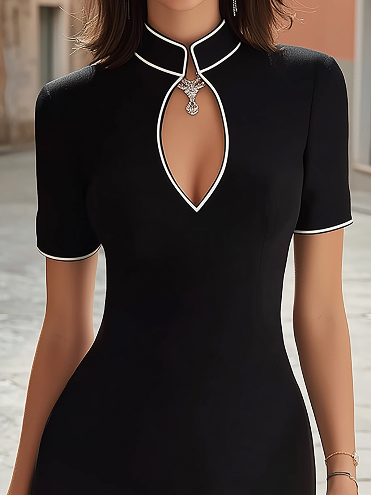 Style this dress with black pointed-toe stilettos and a structured handbag for a sharp, sophisticated look. Add minimalist silver or gold jewelry to highlight the contrast detailing.