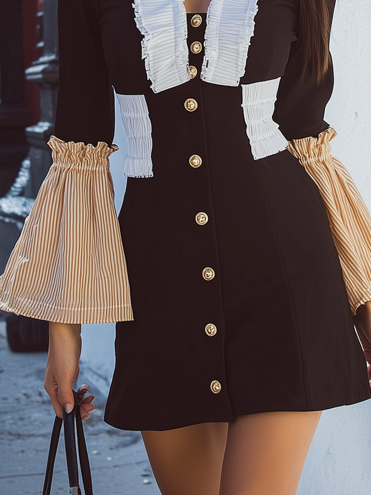 The striped flared sleeves soften the arm lines and echo the contrasting color elements of the main body, enhancing the retro-sweet-cool style.