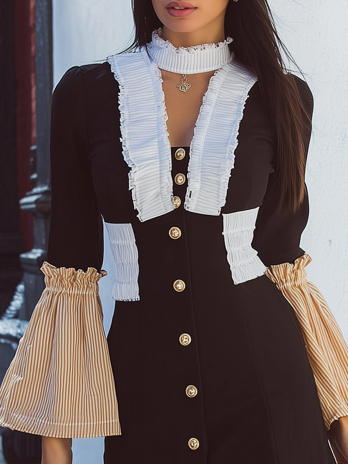 Color-blocked Ruffled Bell Sleeve Dress