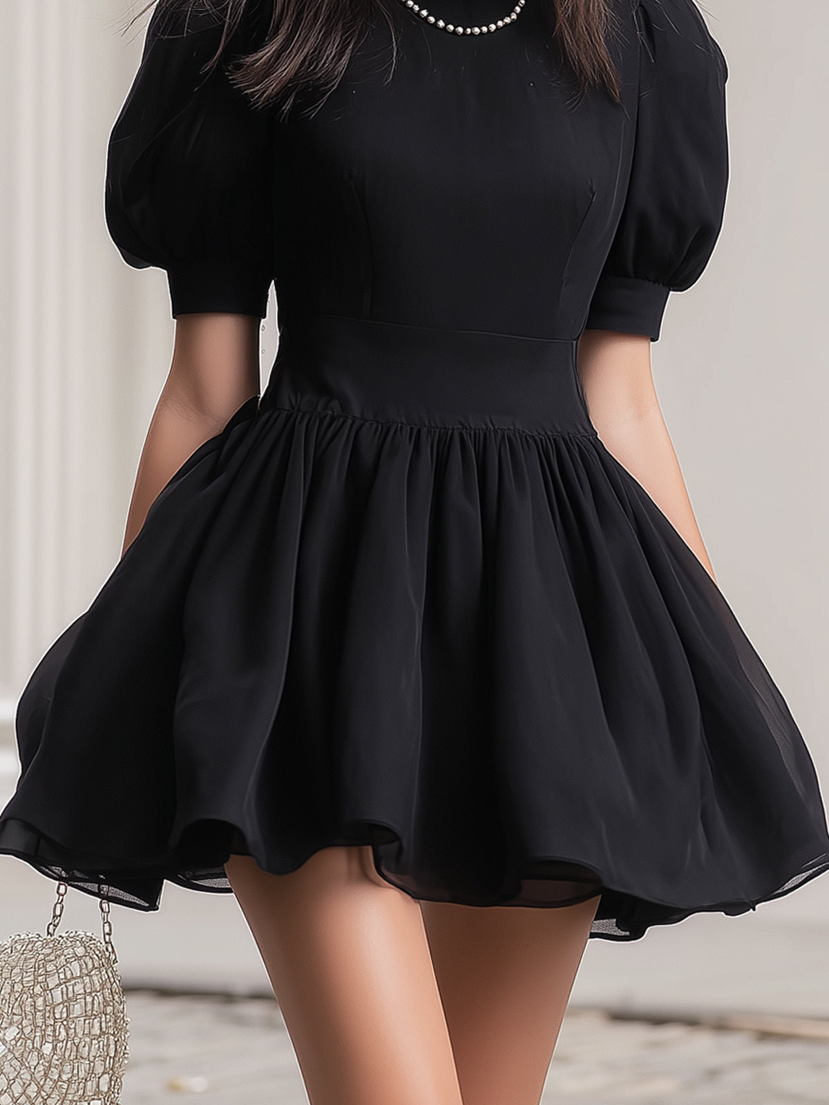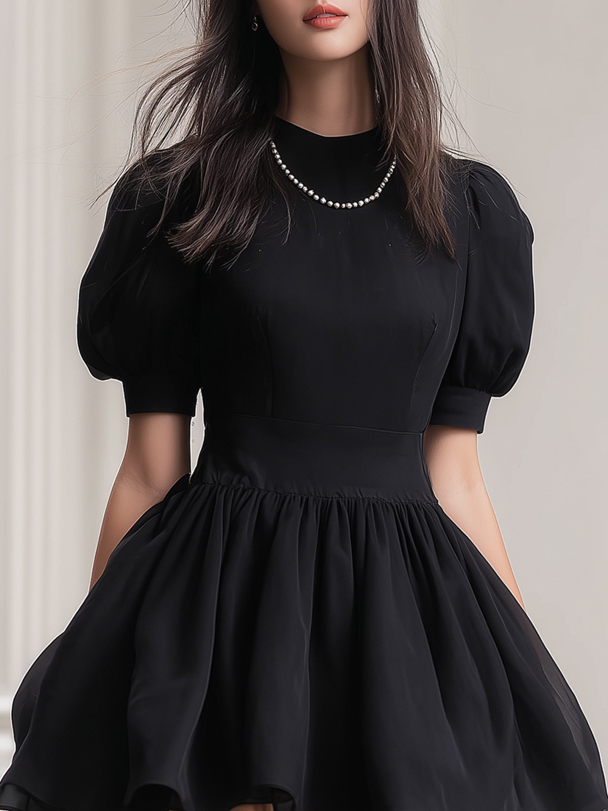 Puff-sleeved Chiffon Little Black Dress
