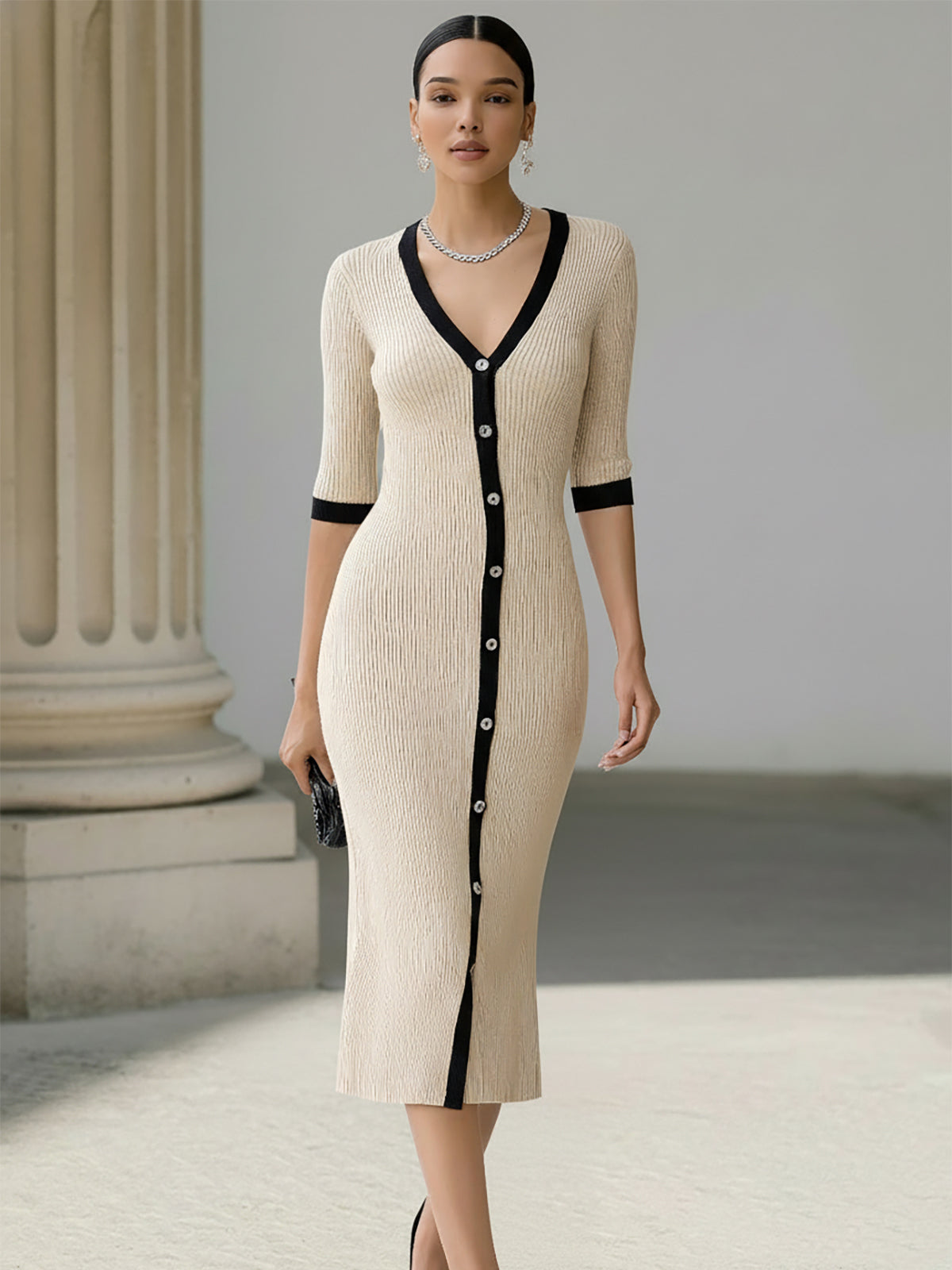 Make a statement with the Beige Knit Midi Dress with Black Trim—a modern, minimalist design tailored for the confident and stylish woman.