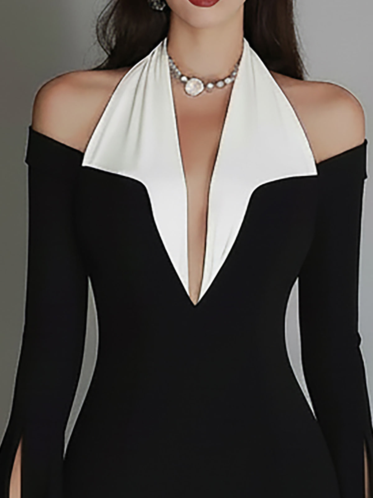 • Design: Features a striking white halter collar that contrasts elegantly with the black dress; includes flared long sleeves for added movement and sophistication, with a clean, minimalist A-line silhouette