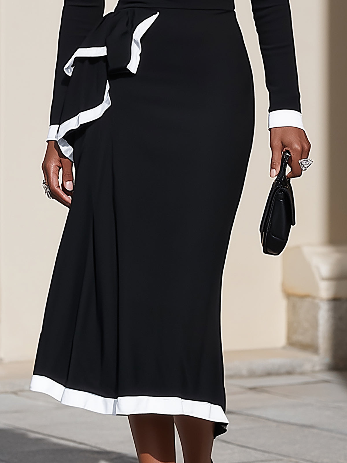 Design: Features a one-shoulder asymmetric neckline with contrasting white stretch fabric detailing along the collar, sleeves, waist, and hem. Includes a vertical black-and-white ruffle at the left waist, irregular hemline, and long sleeves for a modern, minimalist aesthetic