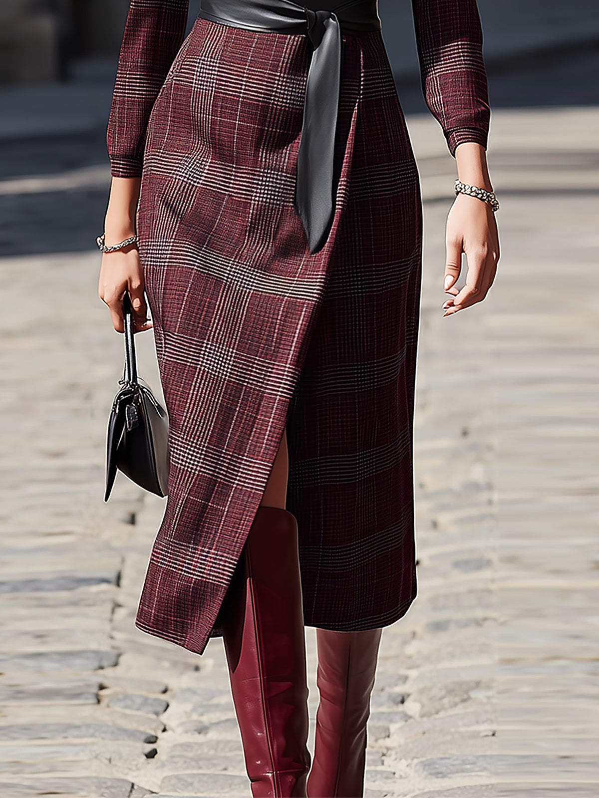 Material: Premium burgundy plaid woven fabric with a soft texture and elegant drape, complemented by a sleek black faux leather belt for a refined finish