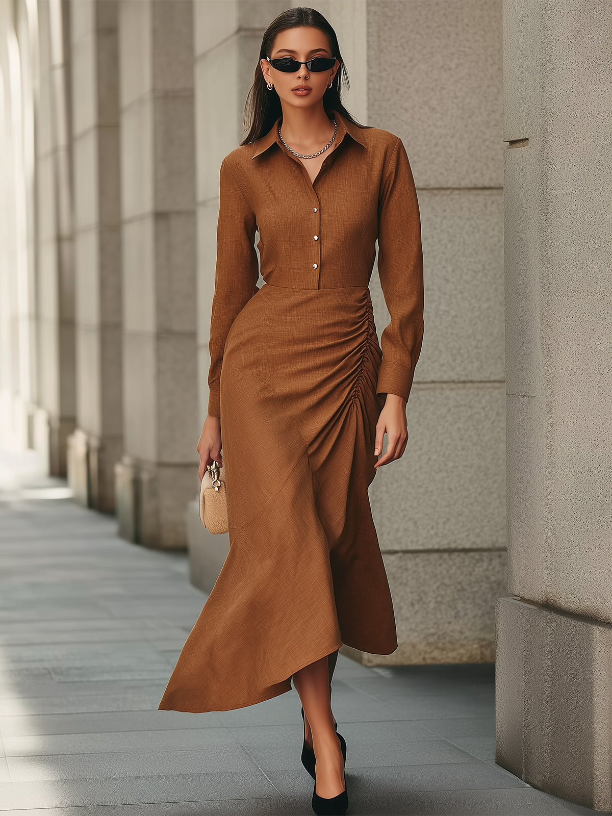 Design: Features a classic shirt collar, long sleeves, and subtle side ruching at the waist to enhance shape. The irregular fishtail hem adds a modern, playful twist while maintaining minimalist elegance