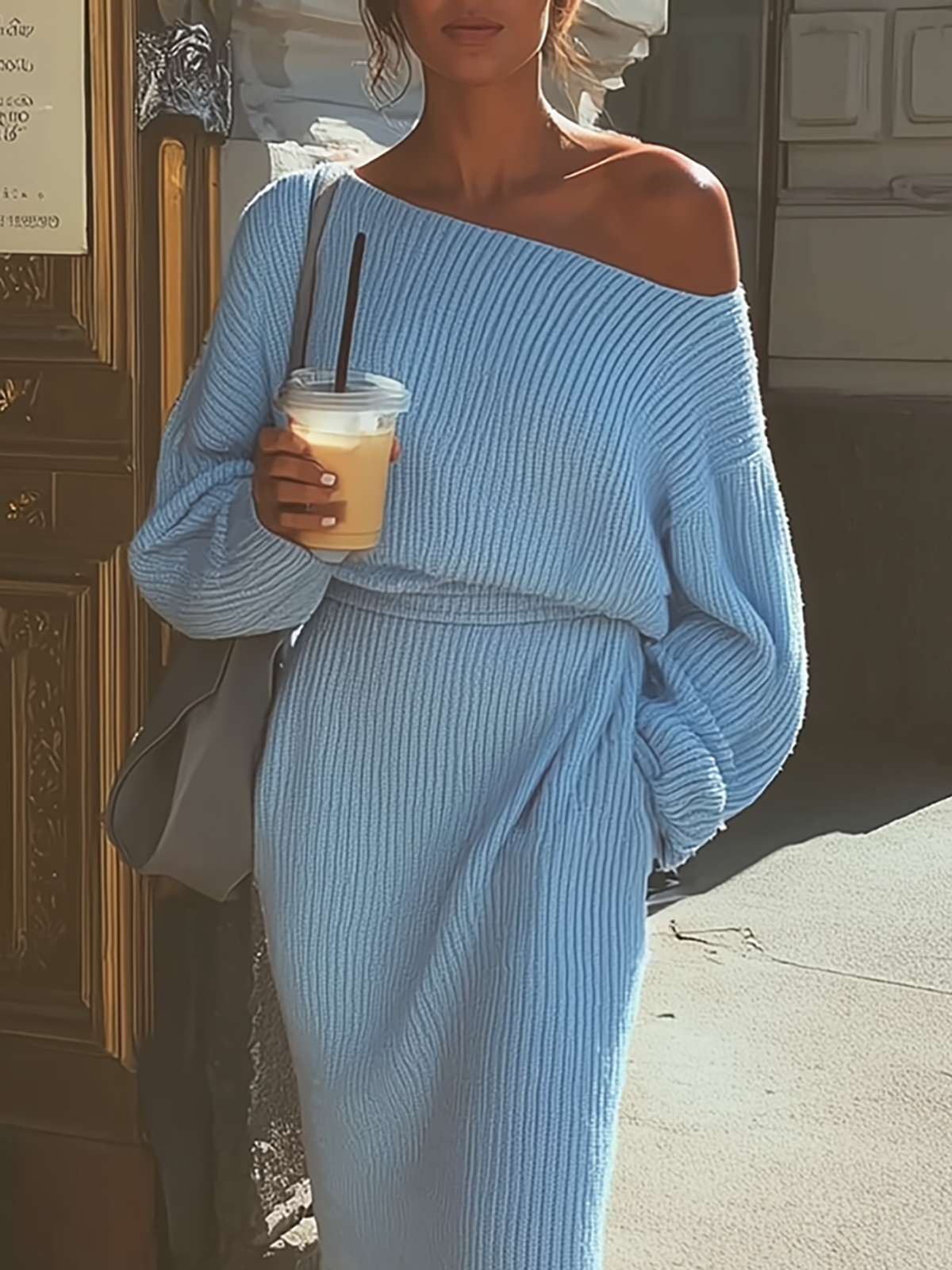 This light blue dress features an alluring off - shoulder design and a maxi length. The ribbed texture adds a touch of style, while the loose fit ensures comfort. Perfect for creating a chic and elegant look, it can be worn for various occasions, pairing well with heels and a stylish bag.