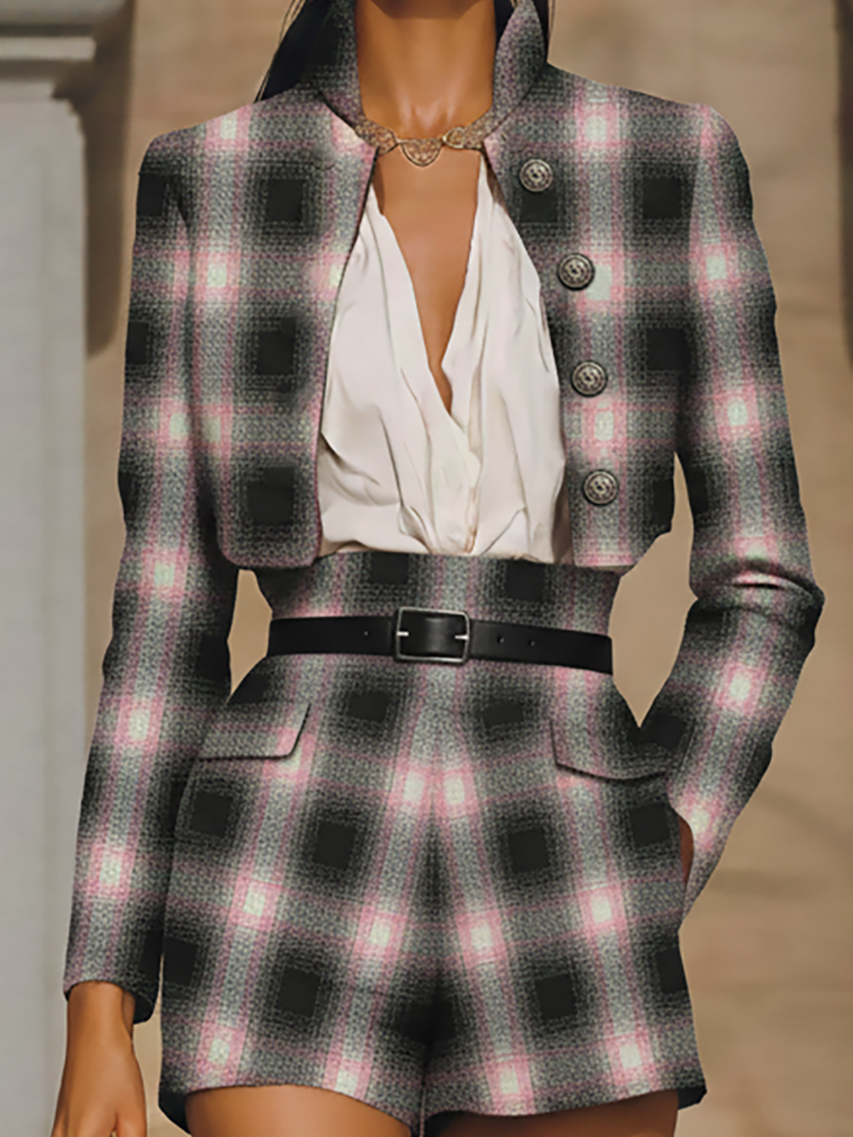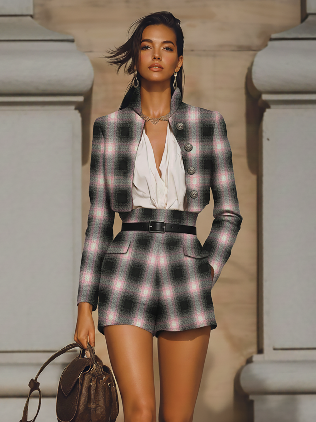 This plaid two-piece set includes a cropped blazer and high-waisted shorts, belted for a tailored look. Its timeless pattern and modern silhouette work for office or casual outings, easily styled up or down.