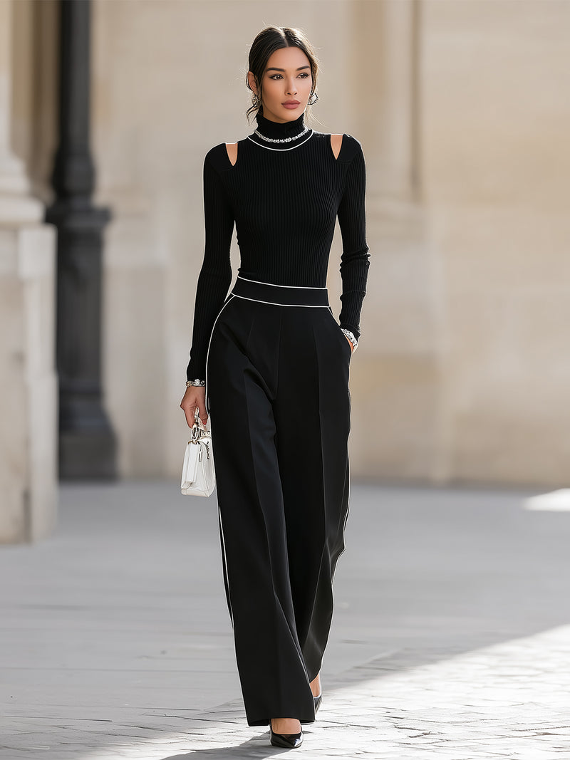 Elegant Black Cold Shoulder Top And Wide Leg Pants Set