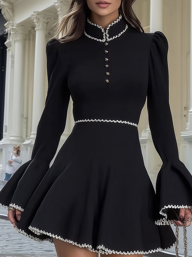 High-neck Flared-sleeve Dress With Ribbon Trim