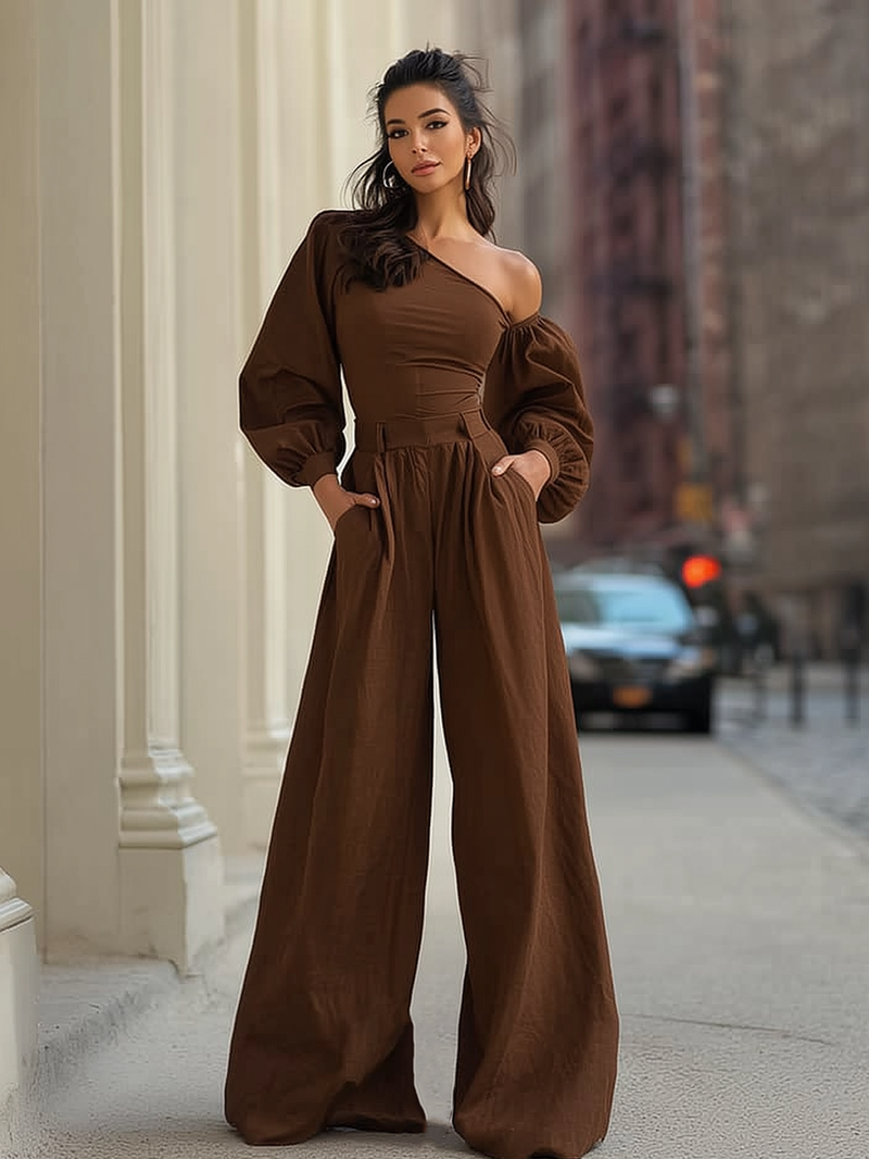 Brown One Shoulder Top And Wide Leg Pants Set With Puff Sleeves