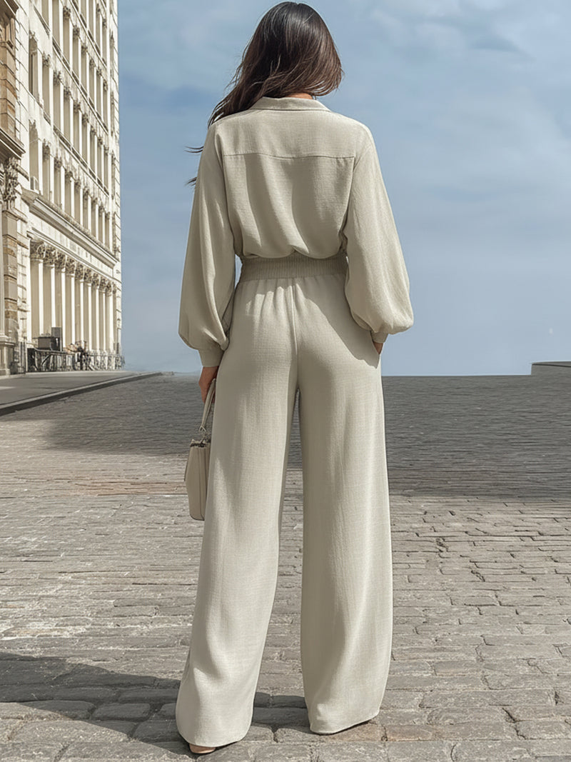 Lantern Sleeve V-neck Top And Wide-leg Pants linen Set