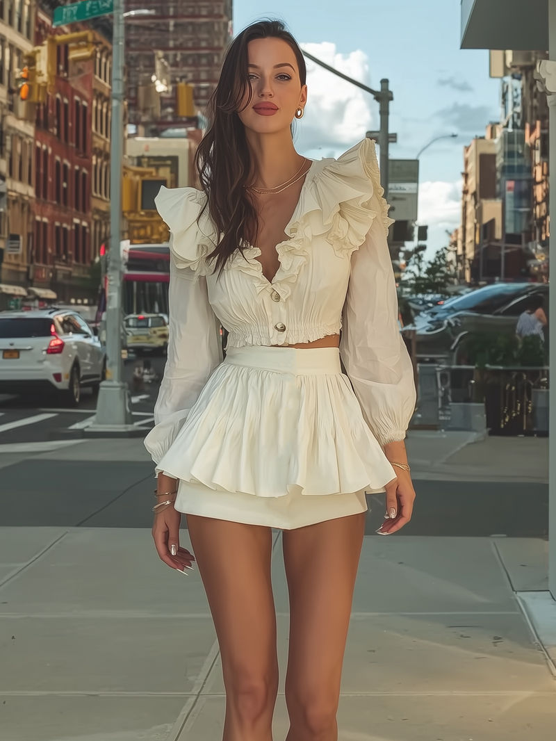 Cream Ruffled Crop Top And Double Layered Skirt Set