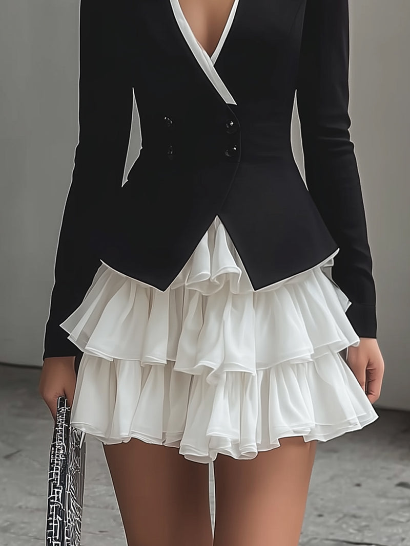 French-style Dress With A Large Lapel Collar And Puff Sleeves