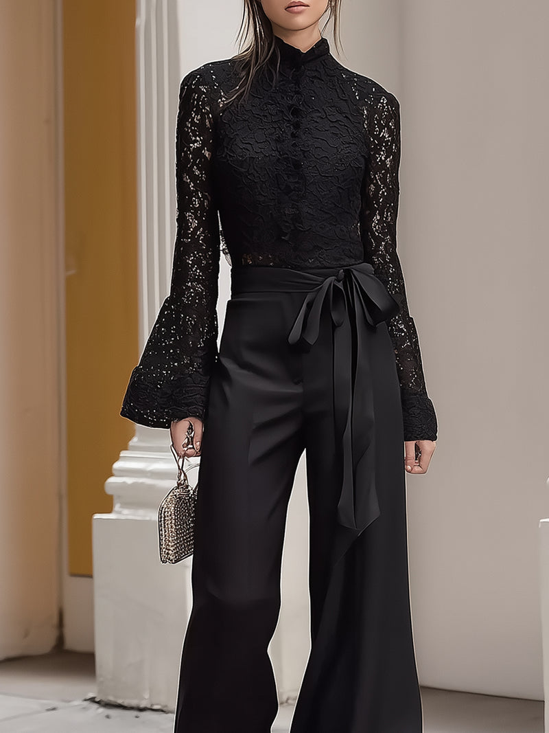Black Lace Bell-sleeved Top And Satin Wide-leg Pants Set