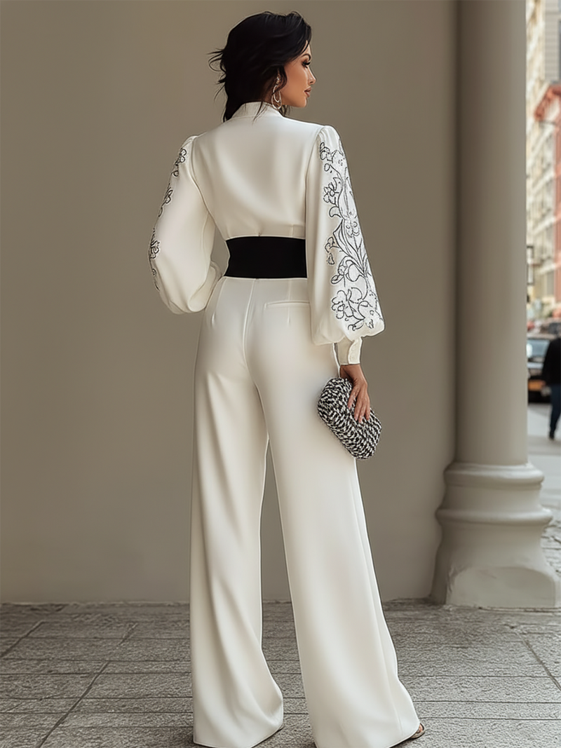 White Stand-up Collar Zip-up Wide-leg Pantsuit