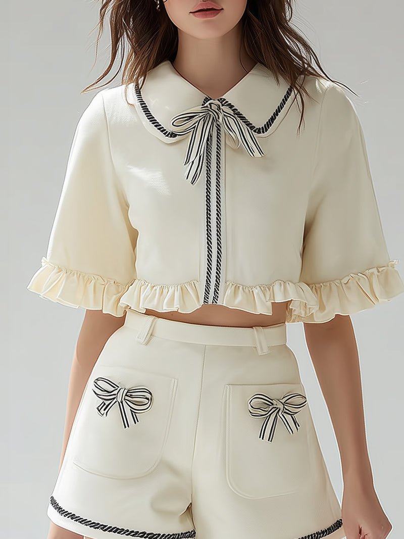Doll Collar Ruffled Top And Bow-detail Shorts Set