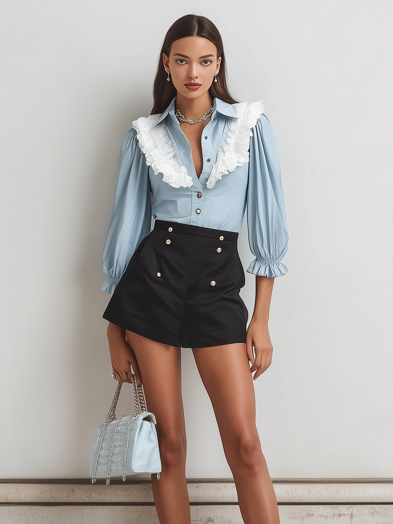 Light Blue Lace Ruffle Blouse And Black Shorts Set