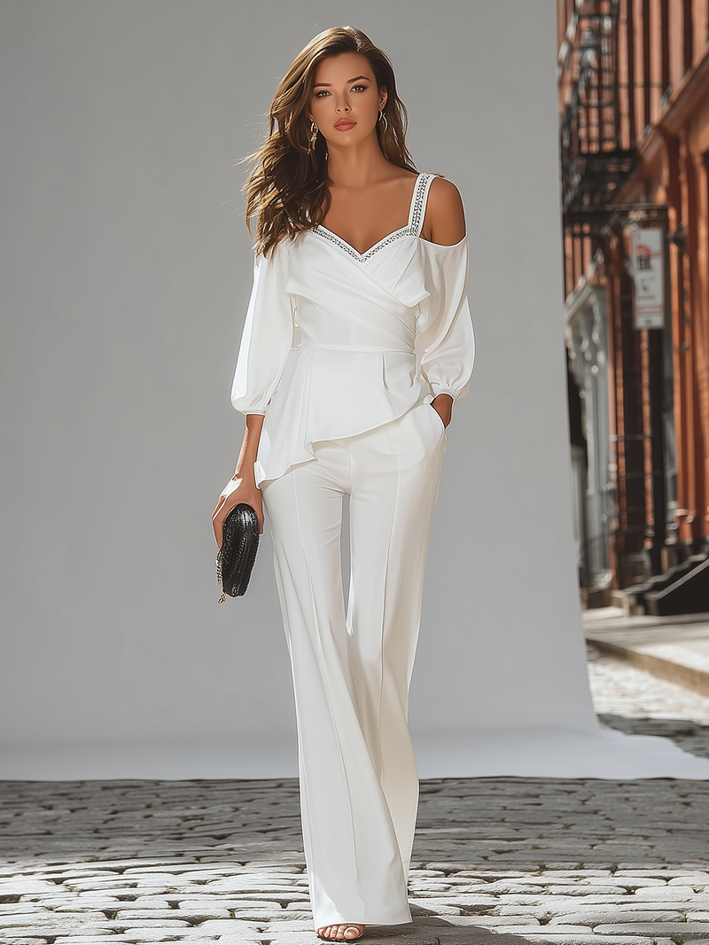 White Cold Shoulder Top And Wide Leg Pants Set