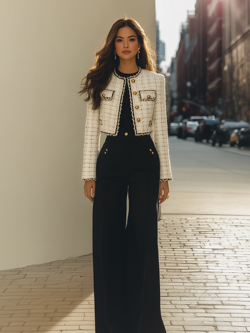 White Tweed Cropped Jacket And Black Wide Leg Pants Set