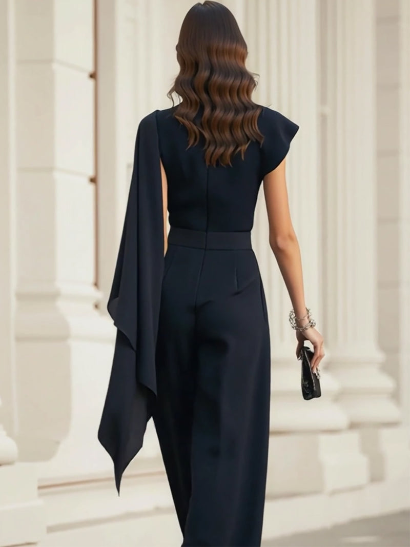 Navy Chiffon Draped Top And Wide Leg Pants Set
