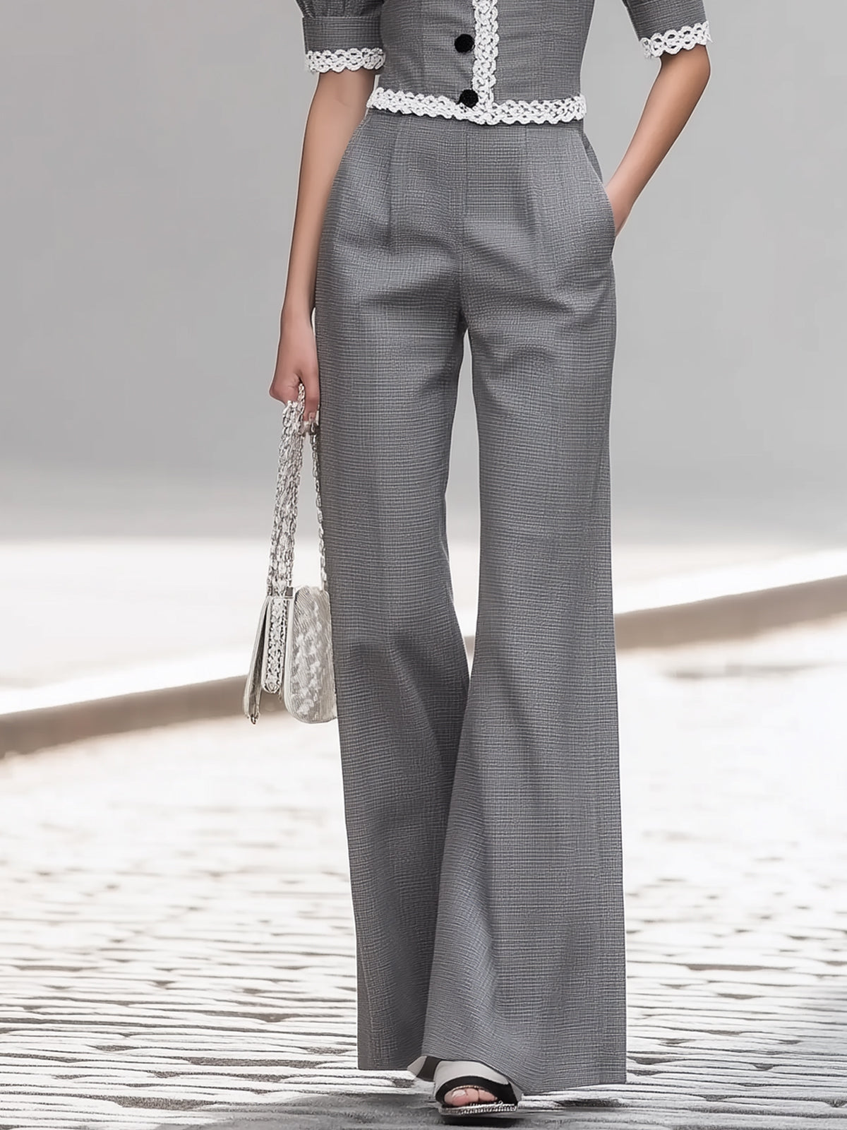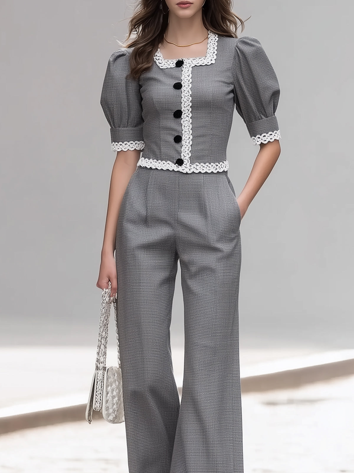 Lace-trimmed Puff Sleeve Wide-leg Suit