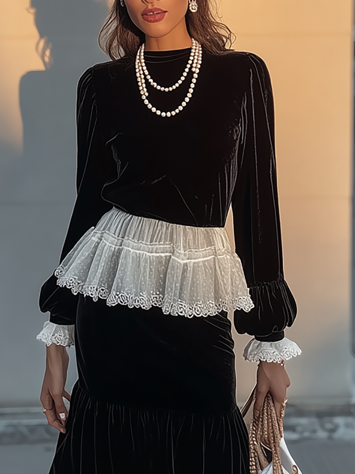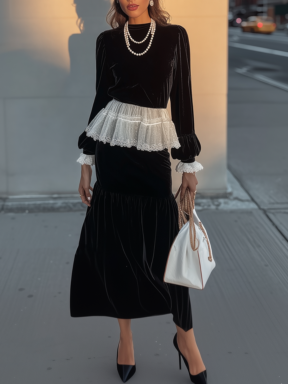 This black midi dress features a striking white lace peplum and cuffs, creating a elegant contrast. The velvet fabric lends a luxurious feel, perfect for special occasions. Pair it with pearls and a chic bag to complete the timeless, sophisticated look, ideal for evenings or formal events.