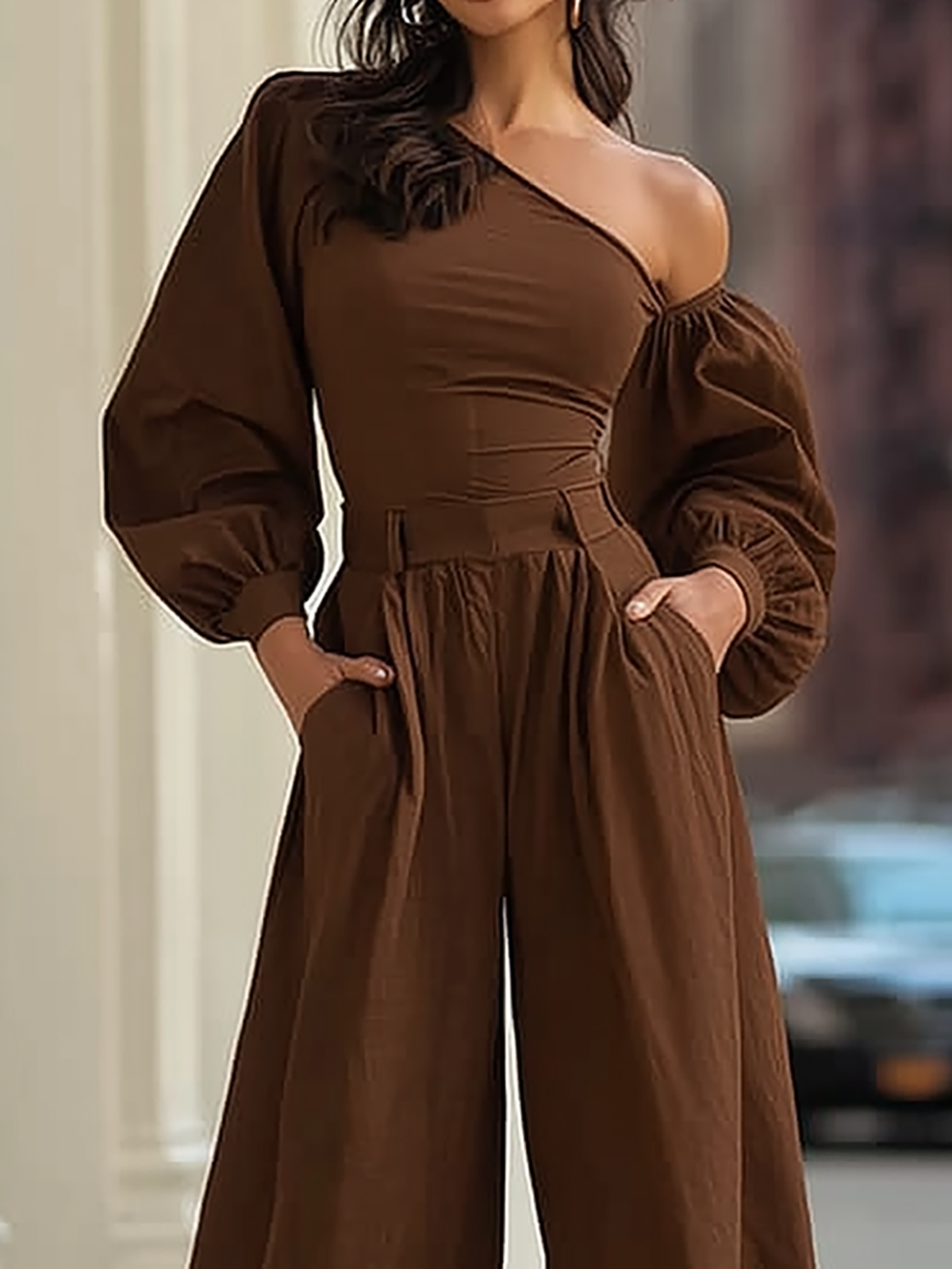 This chic brown two-piece set balances effortless elegance with relaxed charm. It features a one-shoulder top with billowy puff sleeves that add soft volume, paired with high-waisted wide-leg pants that fall in gentle, flowy lines. A cinched waist detail ties the silhouette together, while side pockets add subtle practicality. Ideal for brunch dates or casual outings, its warm chocolate hue and laid-back yet polished shape exude understated luxury—perfect for looking put-together without sacrificing comfort.