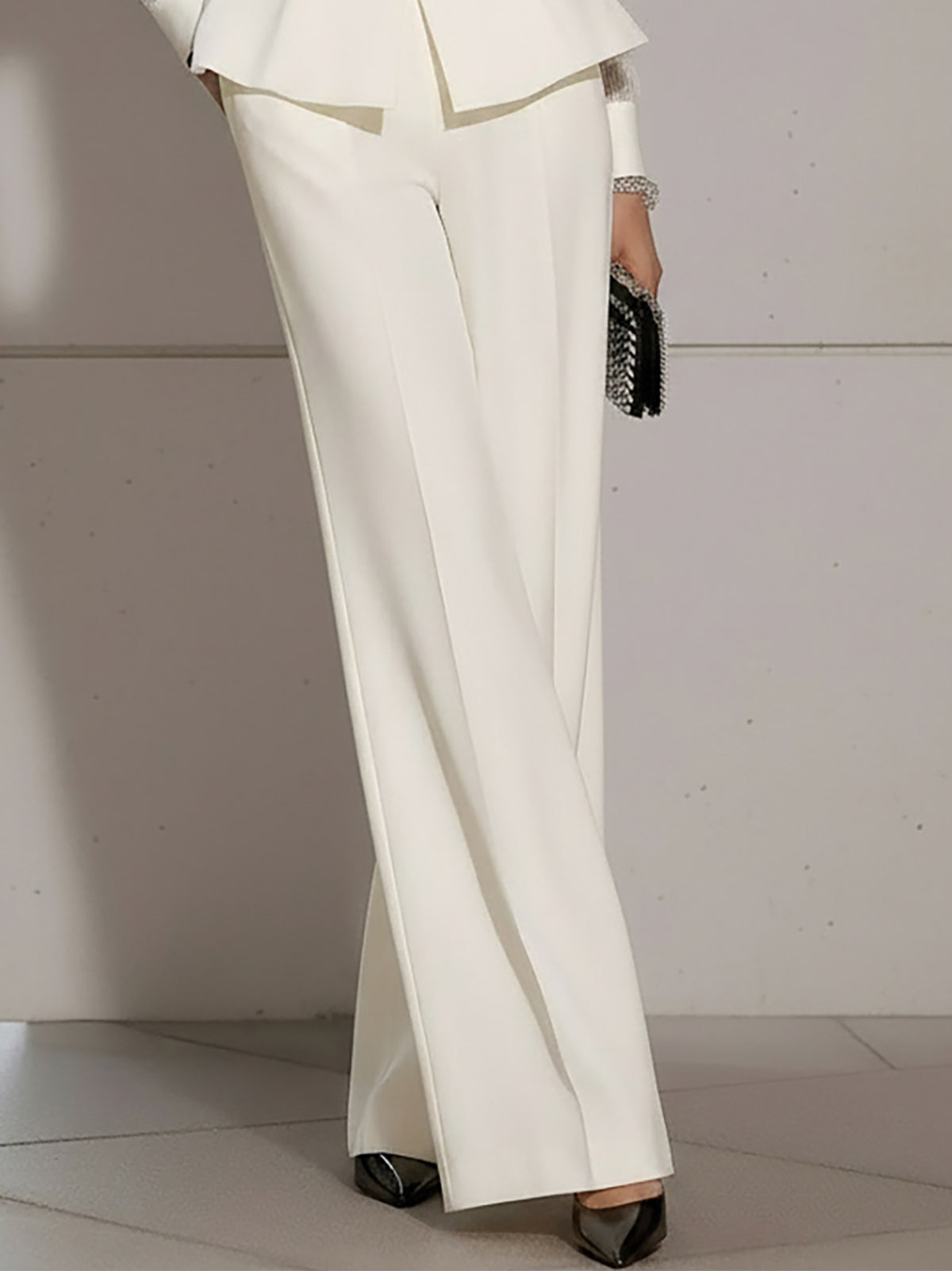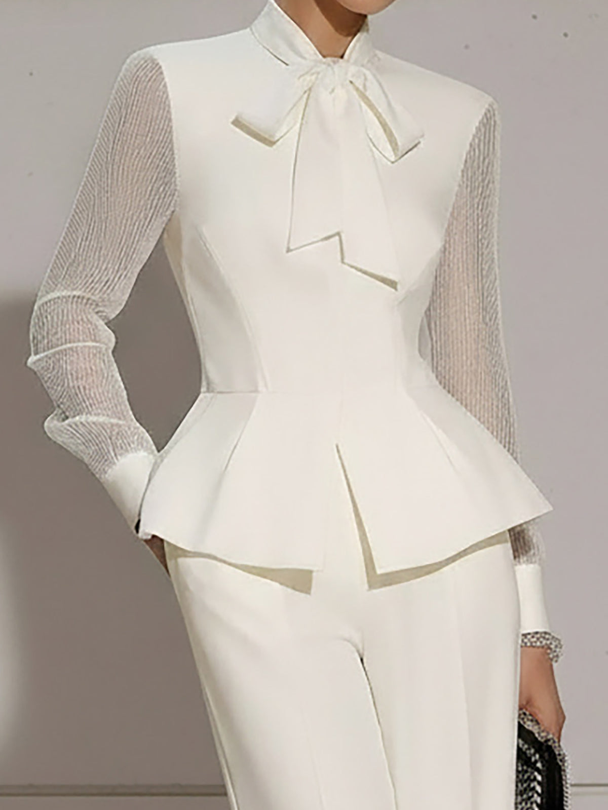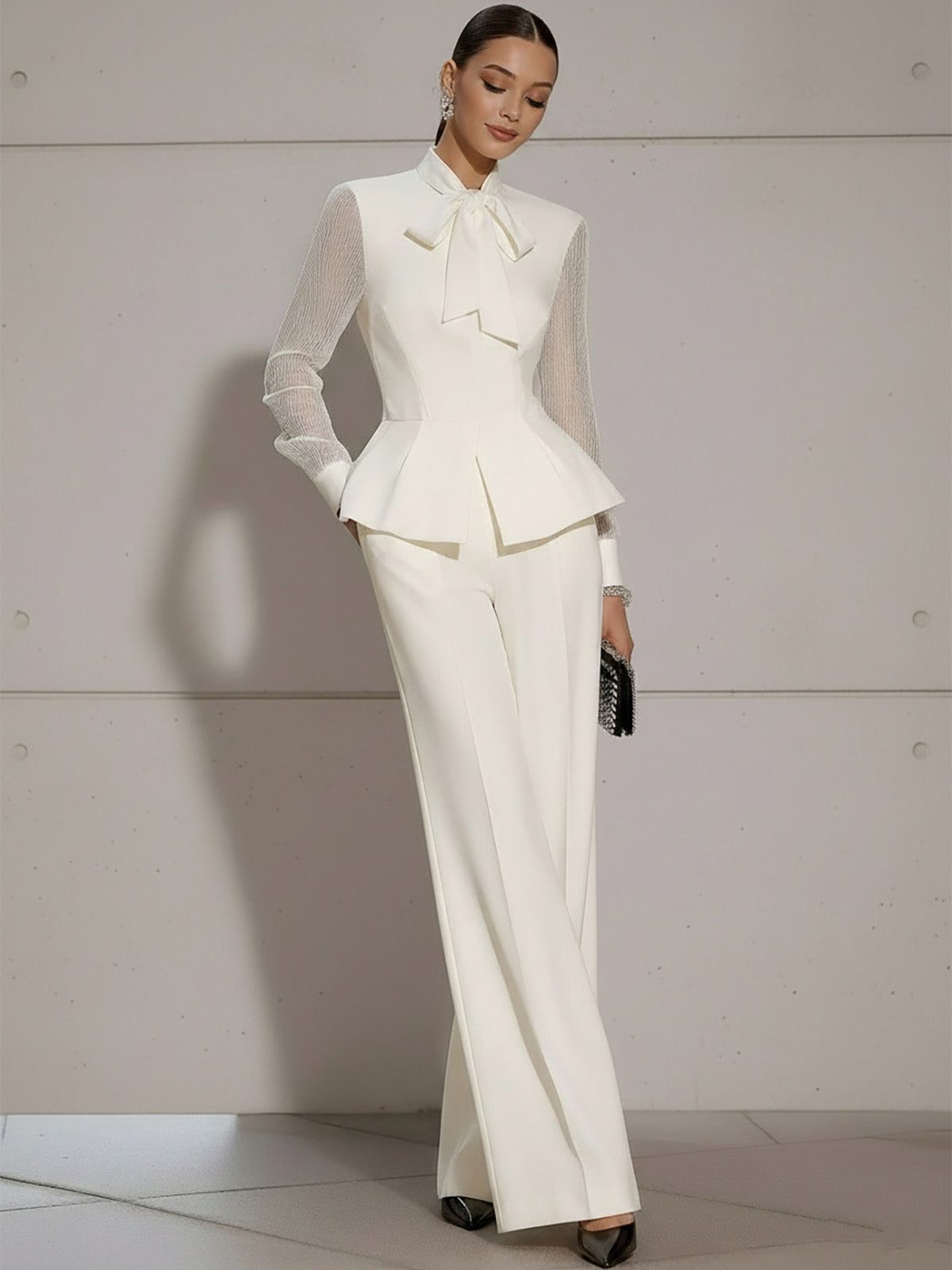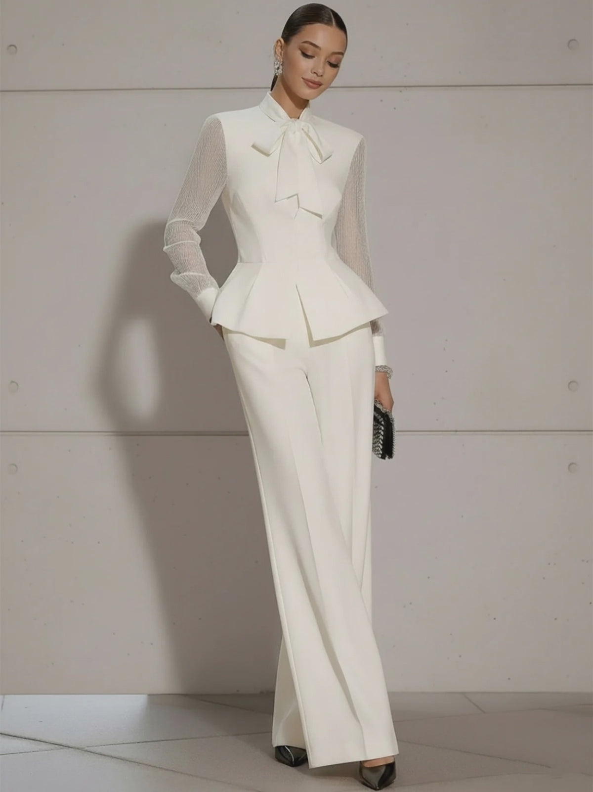 • Design: Features a chic bow-tie detail at the neckline, long sleeves with subtle cuffs, and a slightly loose blouse paired with wide-leg high-waist pants for a refined, minimalist silhouette