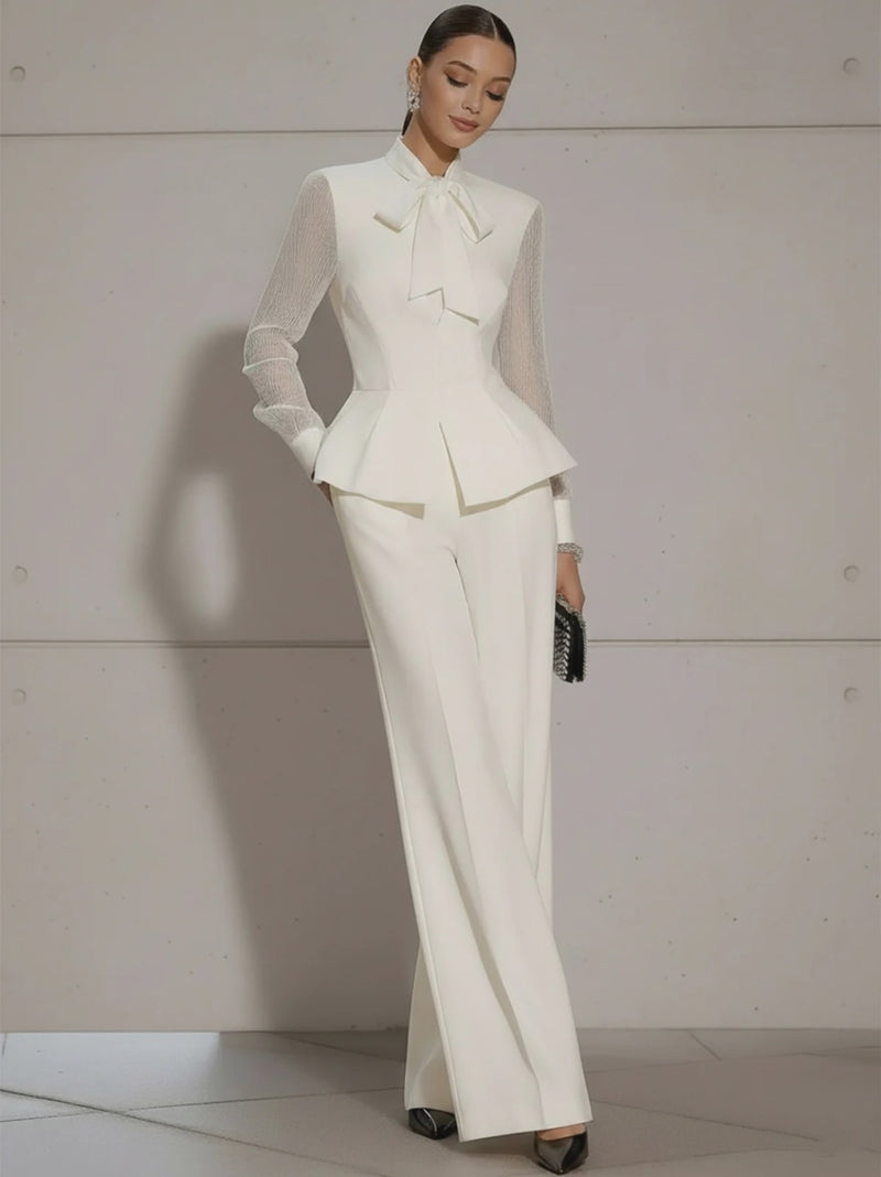 Elegant Cream Blouse With Bow And Wide-Leg Pants Set