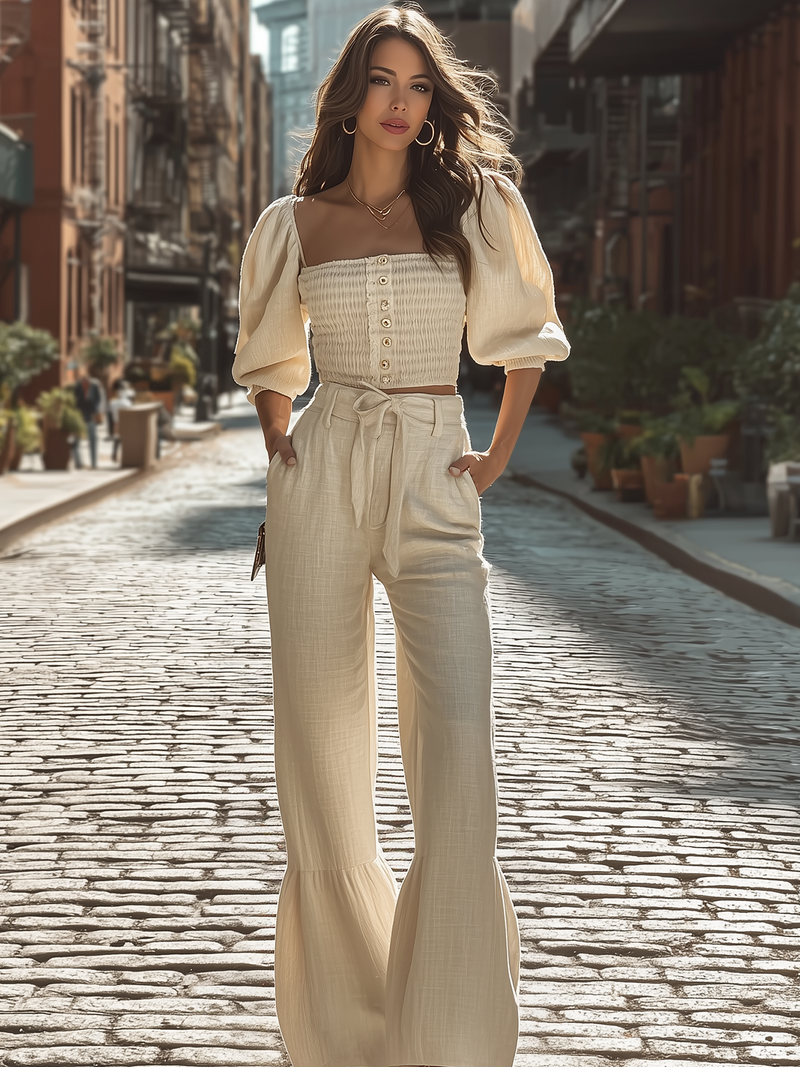 Chic Square Neck Puff Sleeve Top With Wide Leg Pant Set