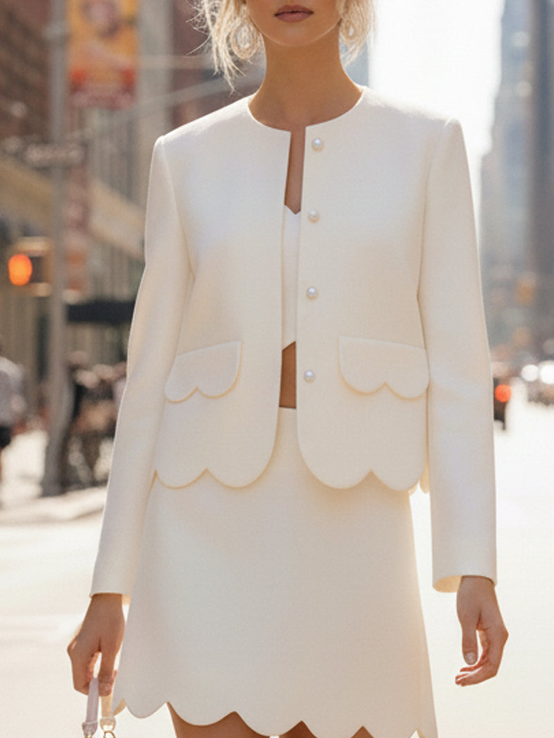 Chic White Cropped Jacket And Midi Skirt Set With Statement Bows