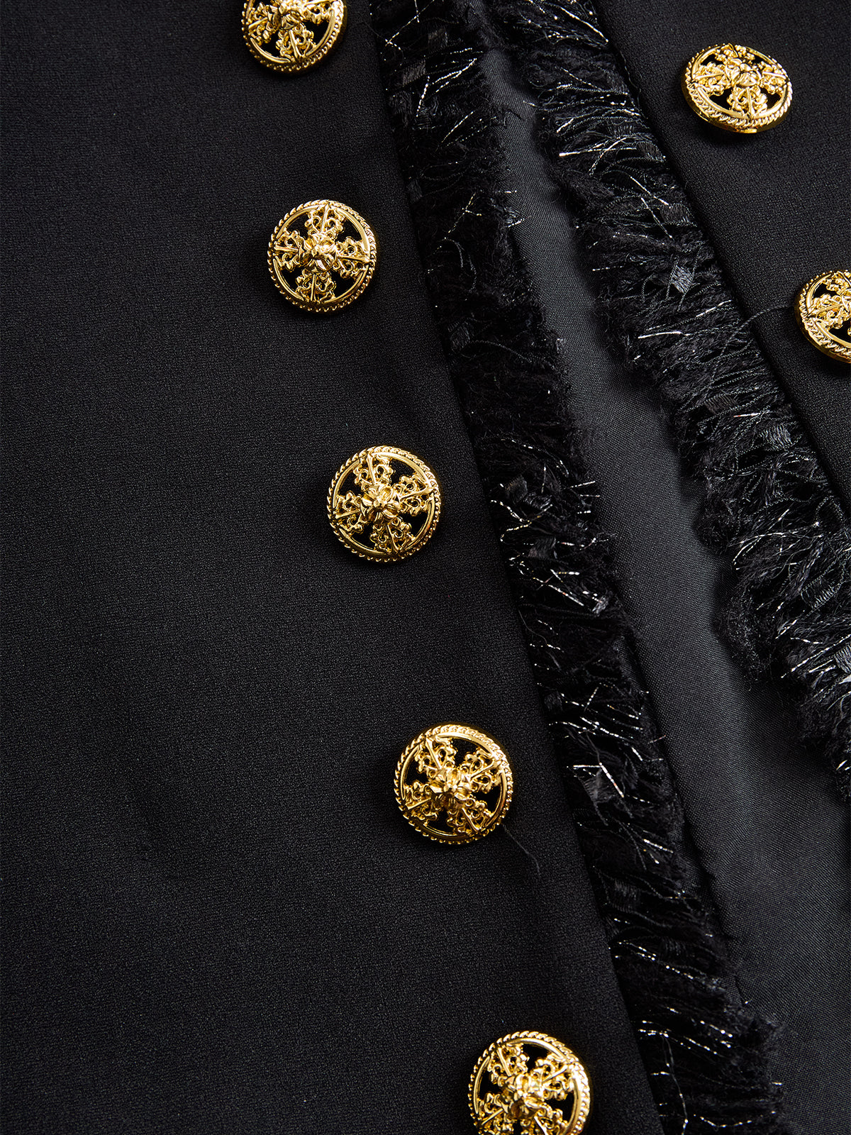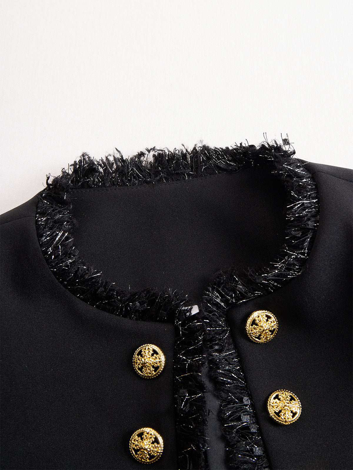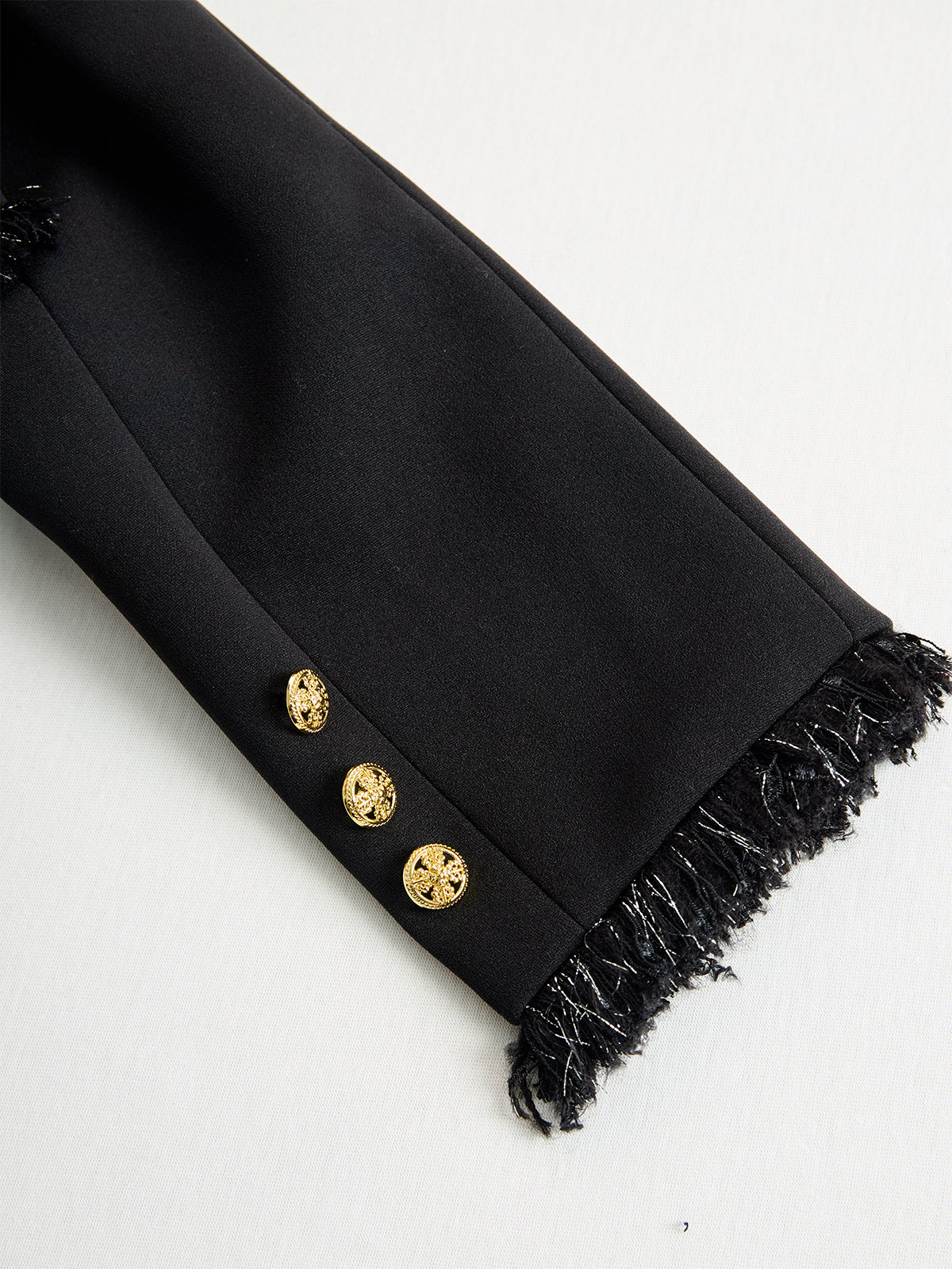 Make a bold fashion statement with the Black Jacket and Pants with Fringe Accents—a contemporary, elegant ensemble for the confident, fashion-forward woman.
