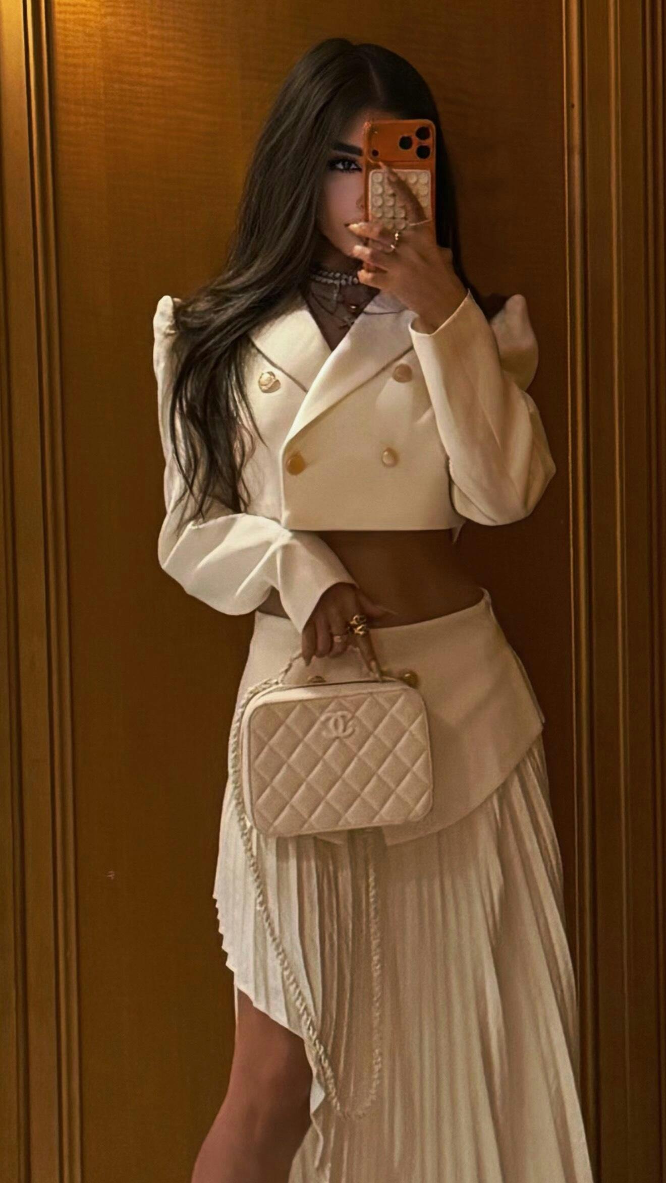 This white suit set is a blend of modern chic and elegance. The cropped double breasted blazer pairs with a high waisted, pleated maxi skirt. Gold buttons and structured shoulders add polish. Perfect for making a statement at events or in the city, it merges tailored sophistication with feminine grace.