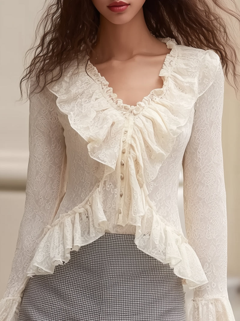 V-neck Ruffled Lace Bell Sleeve Top
