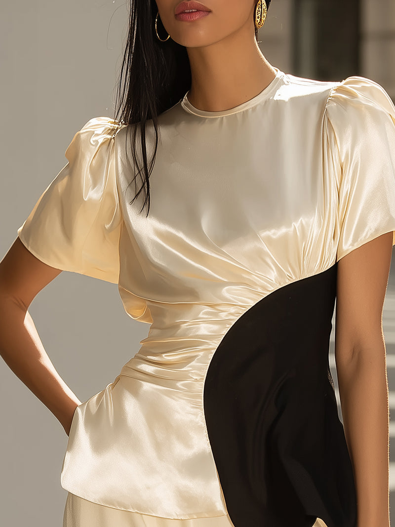 Satin Color-blocked Waist-cinching Puff Sleeve Top