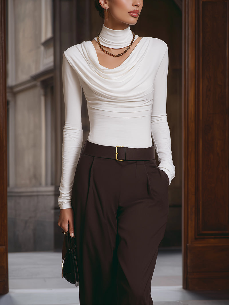 Everyday White Draped Neck Long Sleeve Top