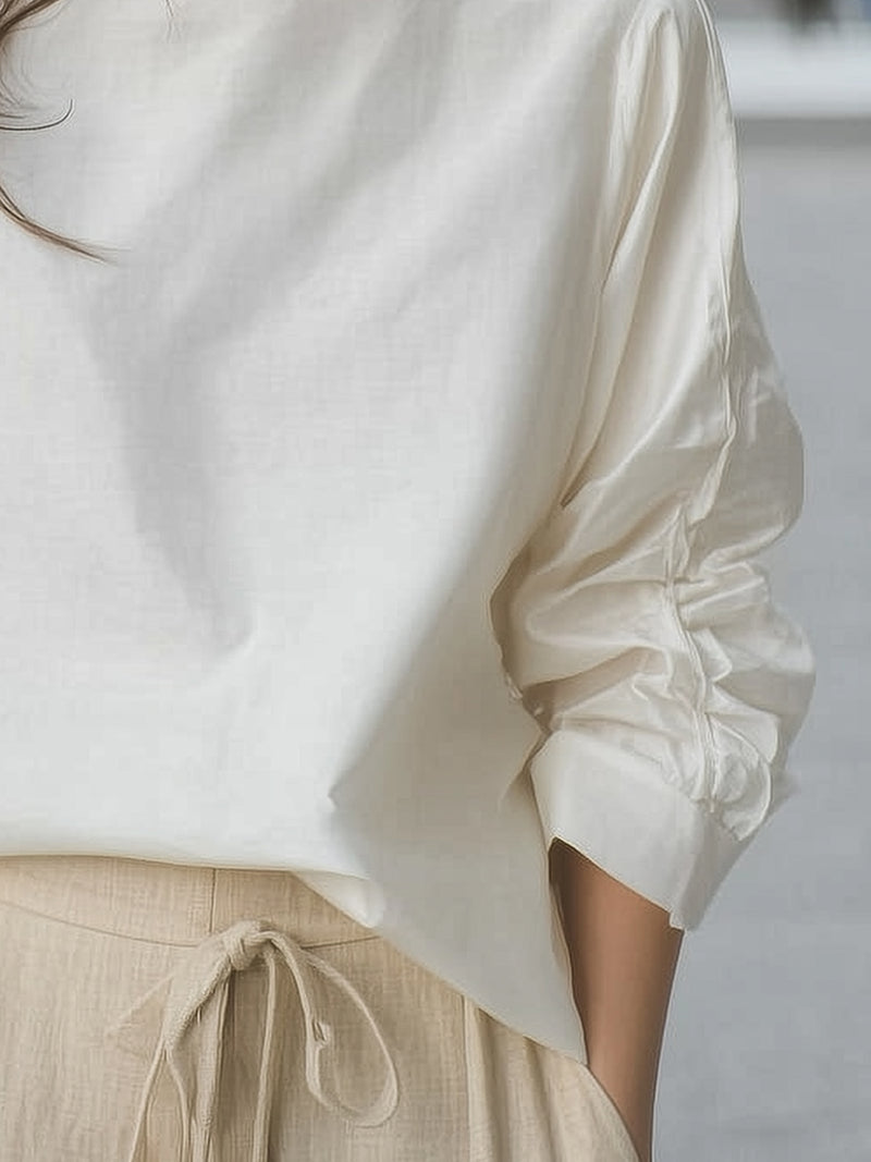 Off-the-shoulder Pleated Sleeve Cotton-linen Shirt
