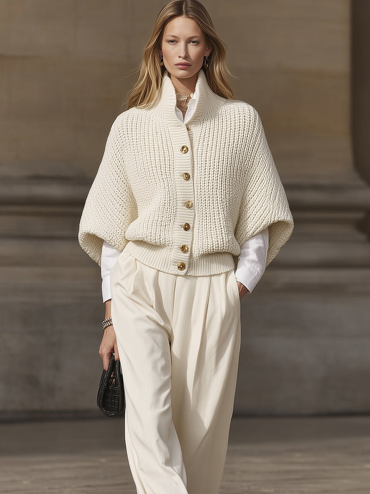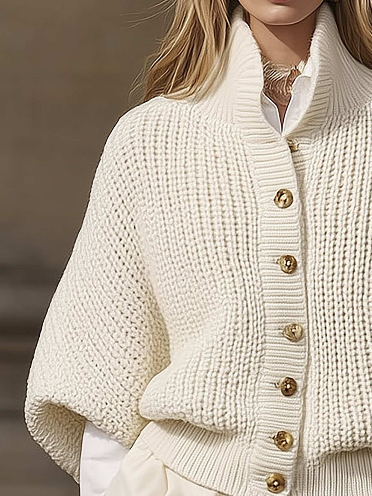 Design: Features a relaxed batwing sleeve design with a high neckline and button-front closure, providing a modern yet cozy silhouette