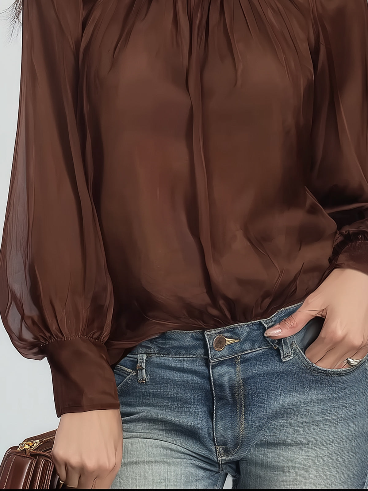 The loose lantern sleeves and slightly sheer fabric retain a flowing feel while minimizing imperfections in the shoulder and arm lines, adding a touch of ethereal charm. The elastic cuffs enhance the fit and comfort.
