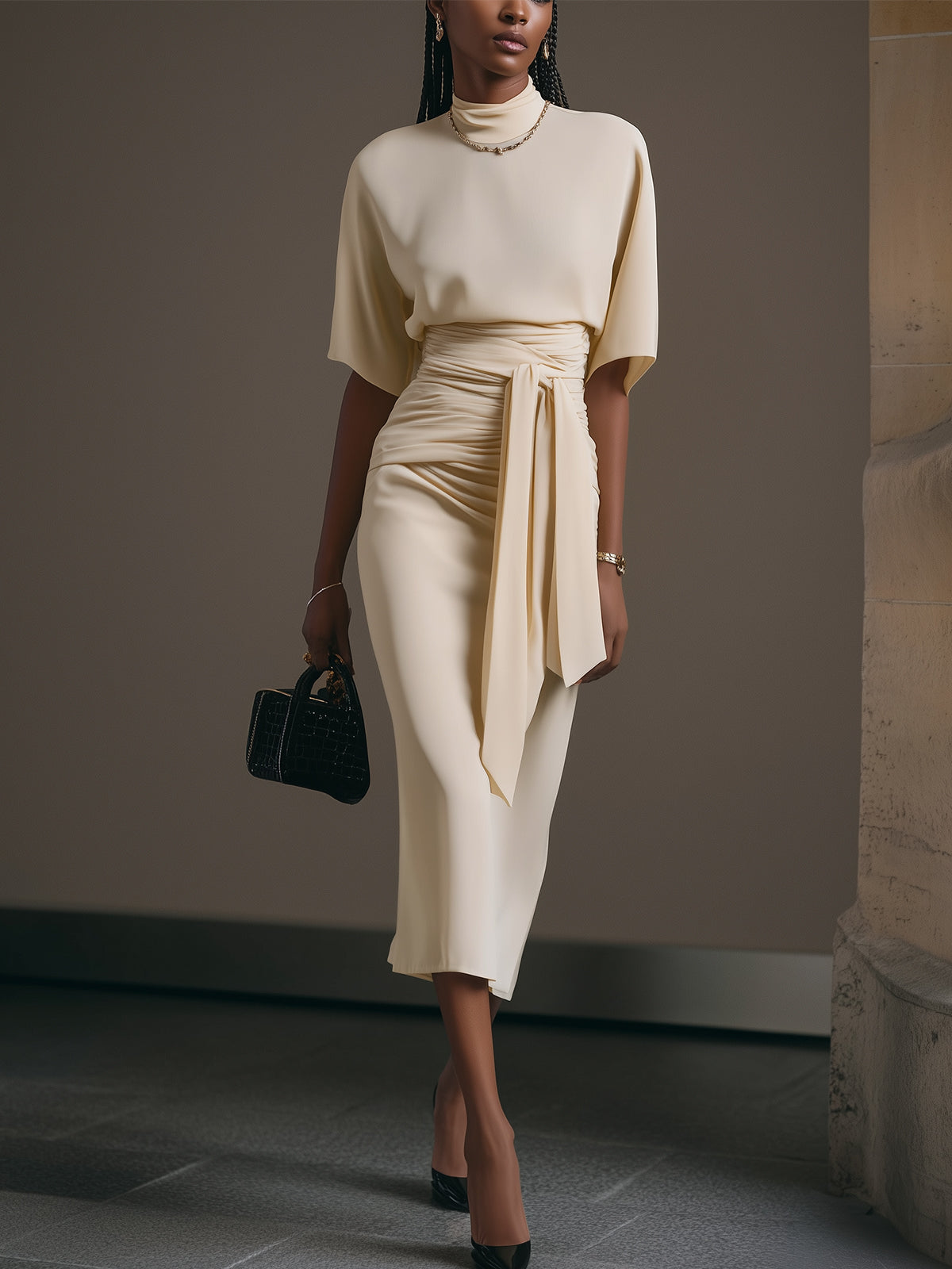 Elevate your wardrobe with the Beige Mock-Neck Tie-Waist Midi Dress—a modern essential designed for understated elegance and confident style.