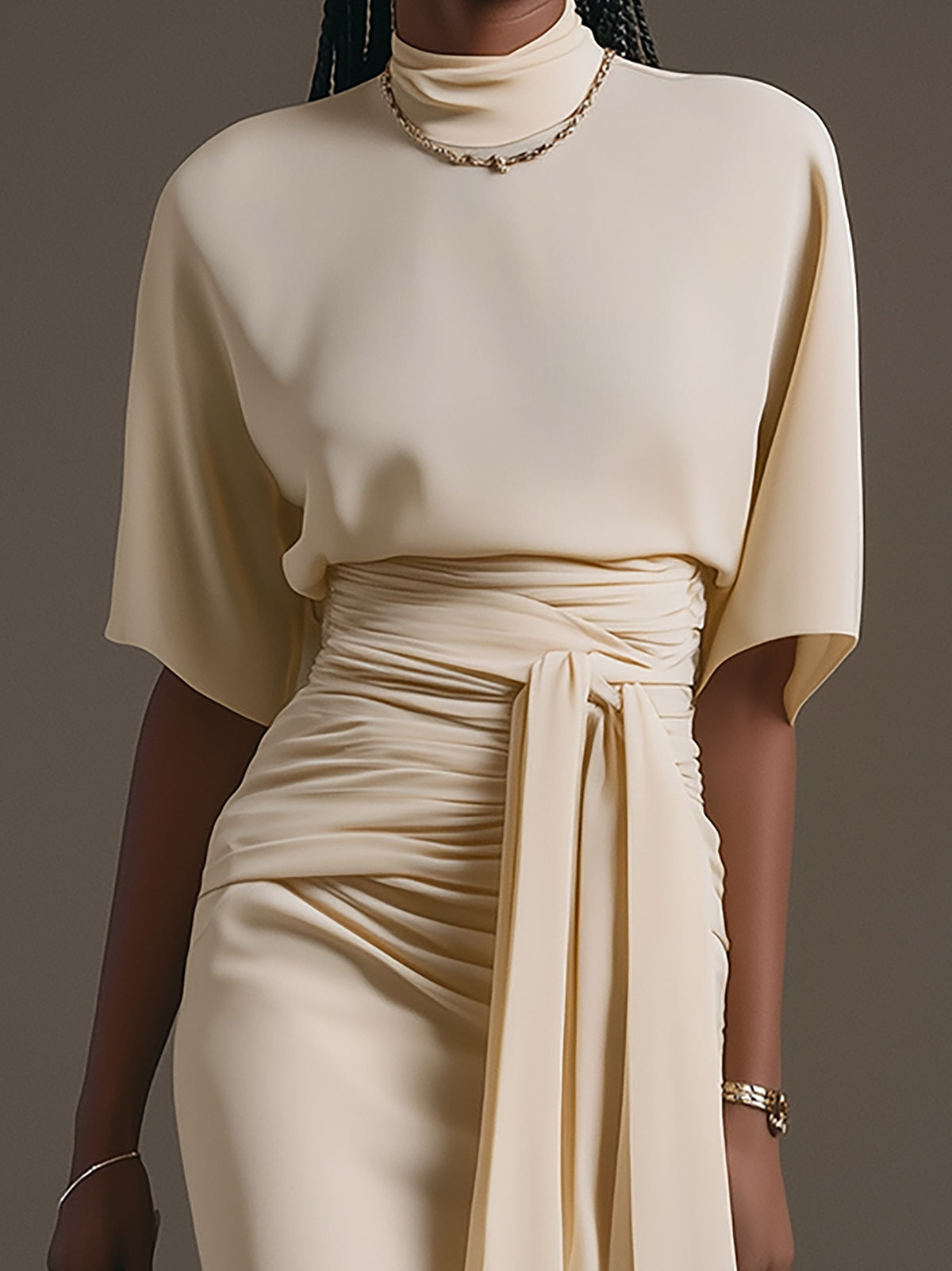 • Design: Features a sophisticated mock neckline and a waist-defining tie detail that enhances the silhouette while maintaining a minimalist, modern aesthetic